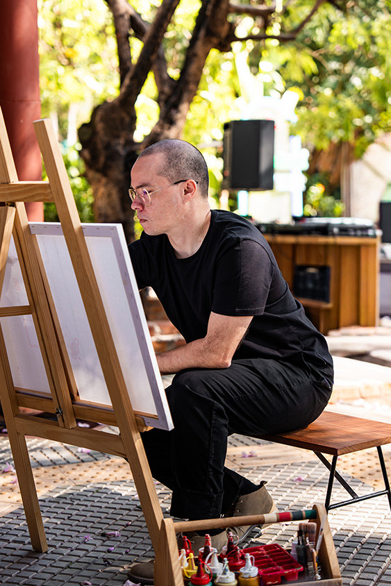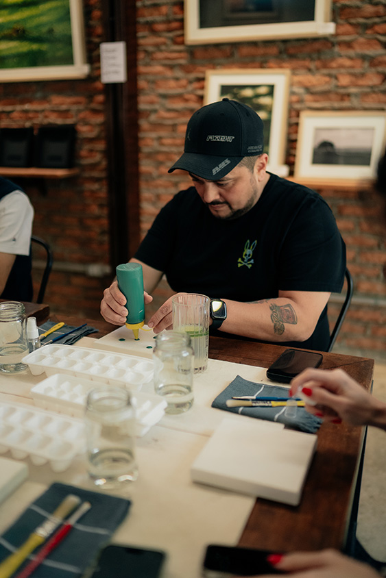 En su caso, el pintor alcanzó un punto de estabilidad donde no solo se siente conforme con su obra, sino también nota que las personas comienzan a reconocer su impronta sin necesidad de ver la firma. “Entonces, es un momento en el que tengo que transmitir más de tú a tú. Quiero que las personas se acerquen a hablarme y conozcan por qué pinto y cómo”, reflexiona. Por esta razón, asienta su taller en este espacio cada miércoles, todo el día, para que puedan ser testigos de su proceso de pintura desde el comienzo hasta el fin.