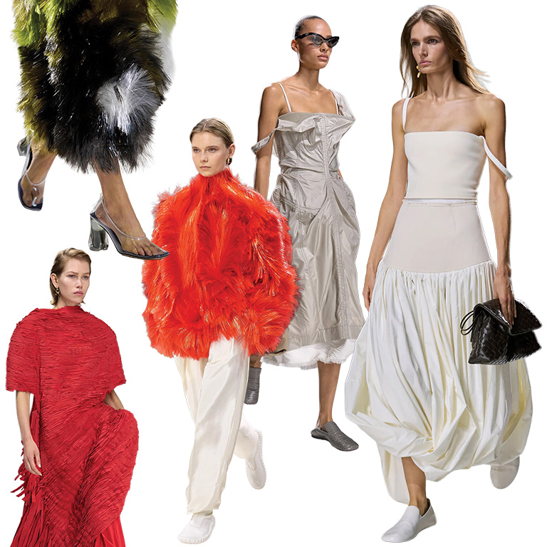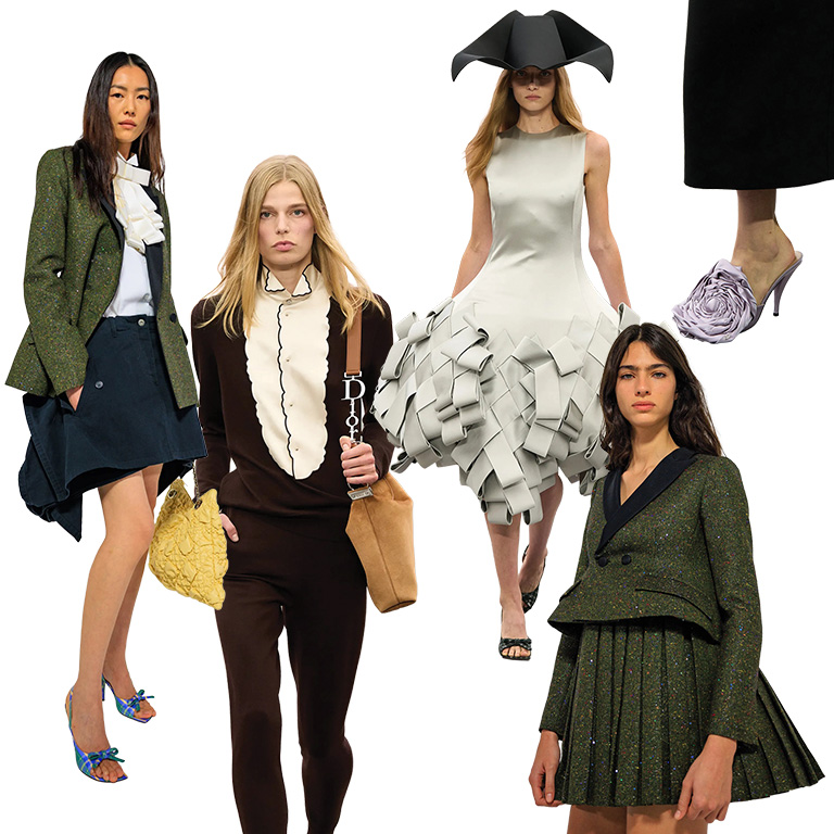 De la mano de Louise Trotter, la más reciente colección de Bottega Veneta generó gran expectativa y cumplió, ya que marcó un retorno a las raíces de la casa. La colección destacó por su profunda inmersión en la artesanía, los detalles y las texturas. El intrecciato —su tejido característico— también tuvo una presencia dominante, visible en detalles de solapas, shorts, abrigos, looks completos y, por supuesto, accesorios clave como bolsos y zapatos. Un elemento sorpresivo y vanguardista fueron las siluetas y faldas construidas a partir de fibras de vidrio, que magnificaron la meticulosa artesanía de la maison.
