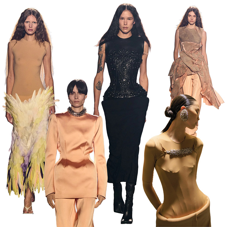 El esperado debut de Miguel Castro Freitas se presentó como un evento teatral que marcó el inicio de una nueva era. La colección honró la herencia de la casa al mostrar las siluetas ya conocidas de Mugler, pero con una paleta de colores renovada. Si bien el negro icónico estuvo presente, predominó un tono nude café, complementado con toques de azul, corales amarillentos y un llamativo degradado de plumas. La propuesta se definió por su estructura, rigidez, volumen, movimiento y sensualidad inherente a la maison. El icónico material de látex se utilizó de forma extensiva y apareció incluso en las medias.