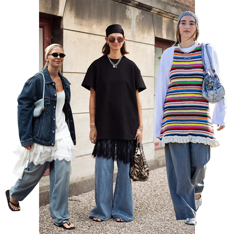 Esta es una tendencia de superposición un poco menos esperada. Inspirada en la era Y2K, la clave está en el juego de texturas y volúmenes. Admite combinaciones de vestidos lenceros con o sin encajes, pantalones holgados o jeans de pierna ancha. Un buen contraste también pueden ser los vaqueros rotos con un vestido vaporoso.